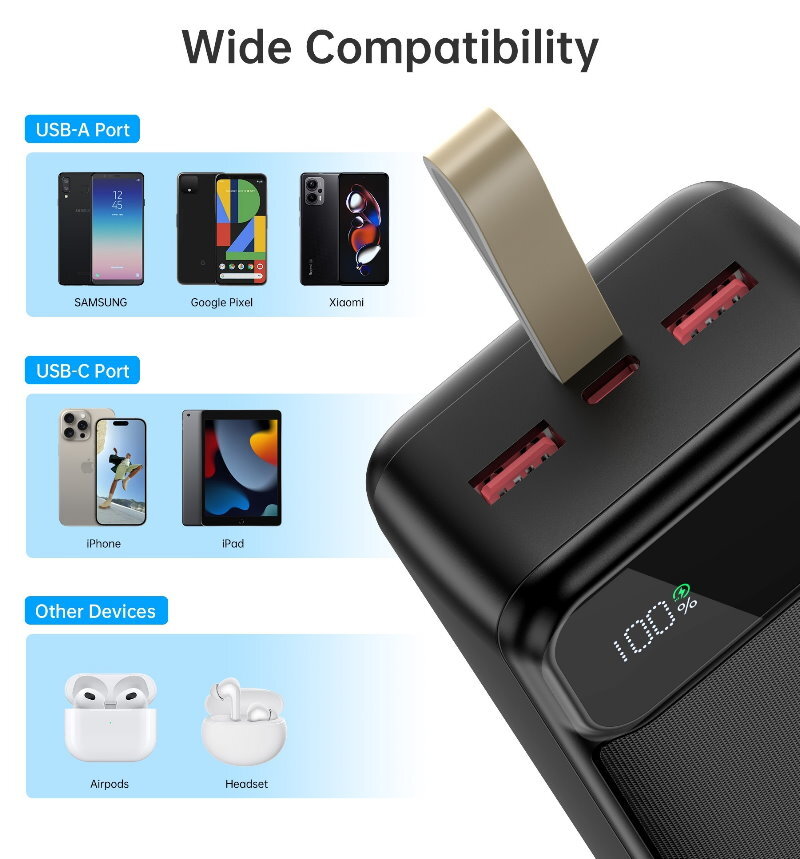 The portable charger features a true 40000mAh/30000mAh/20000mAh/10000mAh battery capacity, ensuring prolonged battery life and multiple recharges on a single charge, delivering reliable power support for your devices.