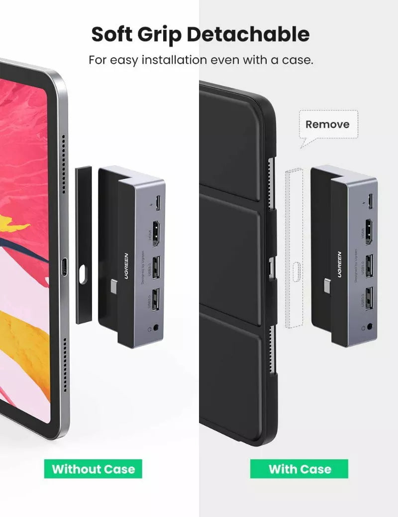 The USB C Data hub is with a flexible snap and detachable grip design. It can perfectly fit your iPad Pro snugly without any loose.