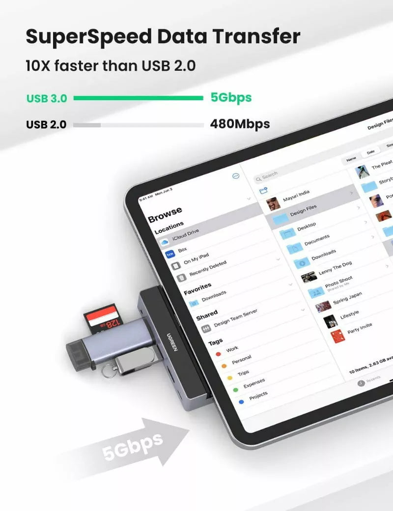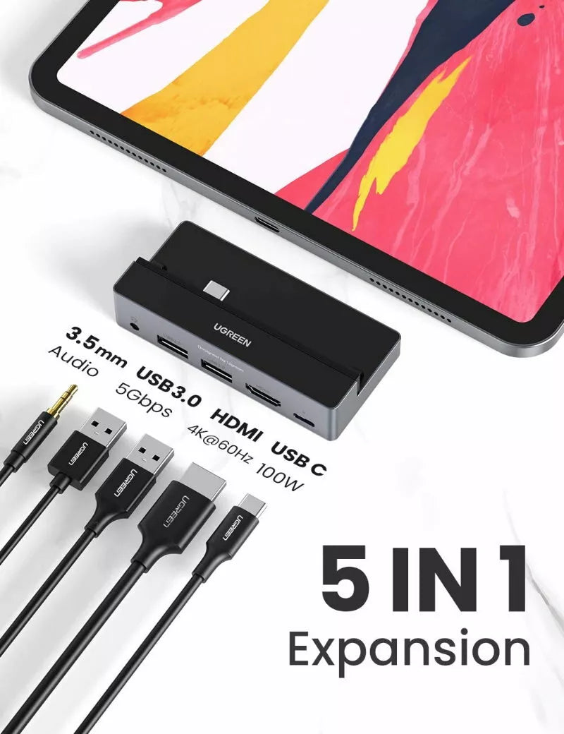 - UGREEN USB C Hub for iPad expands with a 4K 60Hz HDMI video output, 100W USB C PD charging port, 2 USB 3.0 ports, and 3.5mm audio ports. You can directly use it as a computer for home office work, family movie watching, listening to music. Great to improve your work efficiency and living happiness.