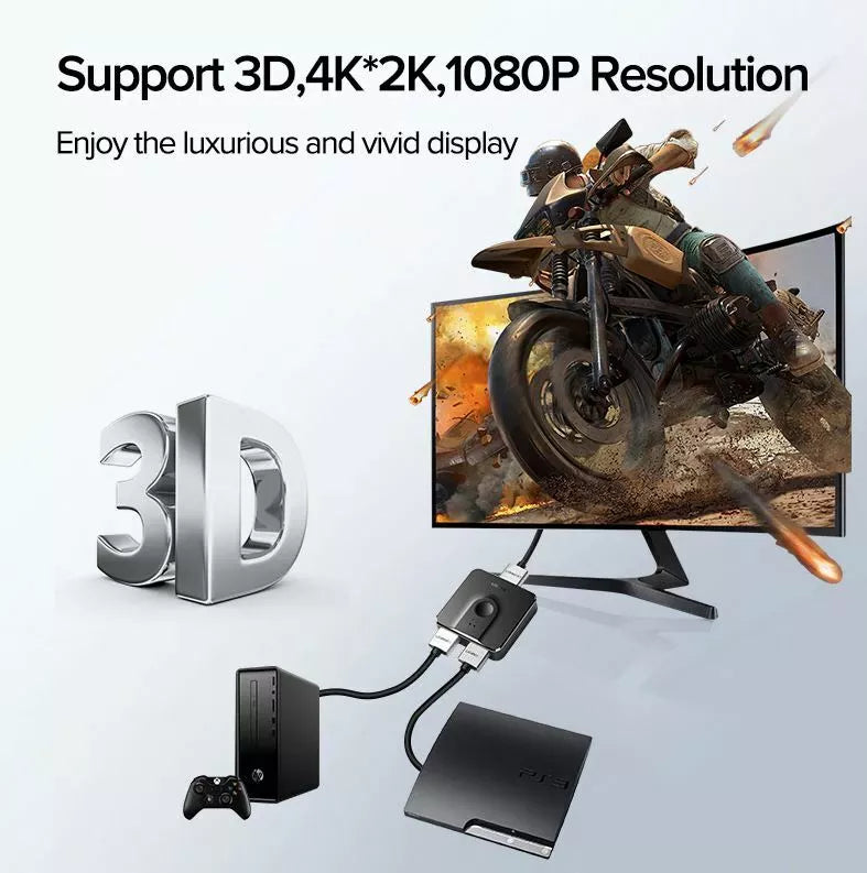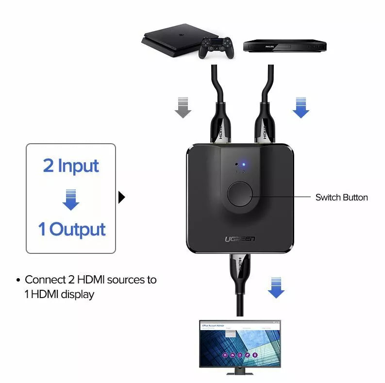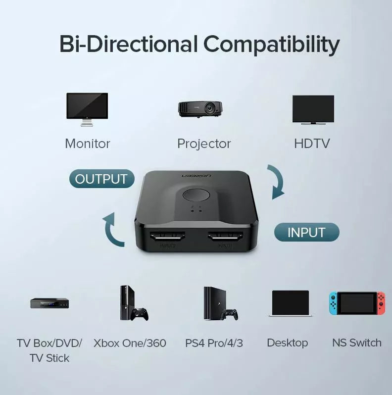 BI-DIRECTIONAL HDMI SWITCH - Ugreen HDMI switch can do bidirectional work, help you connect two HDMI sources to one HDMI display or connect one HDMI source to toggle between two displays (2 monitors CANNOT display simultaneously.)